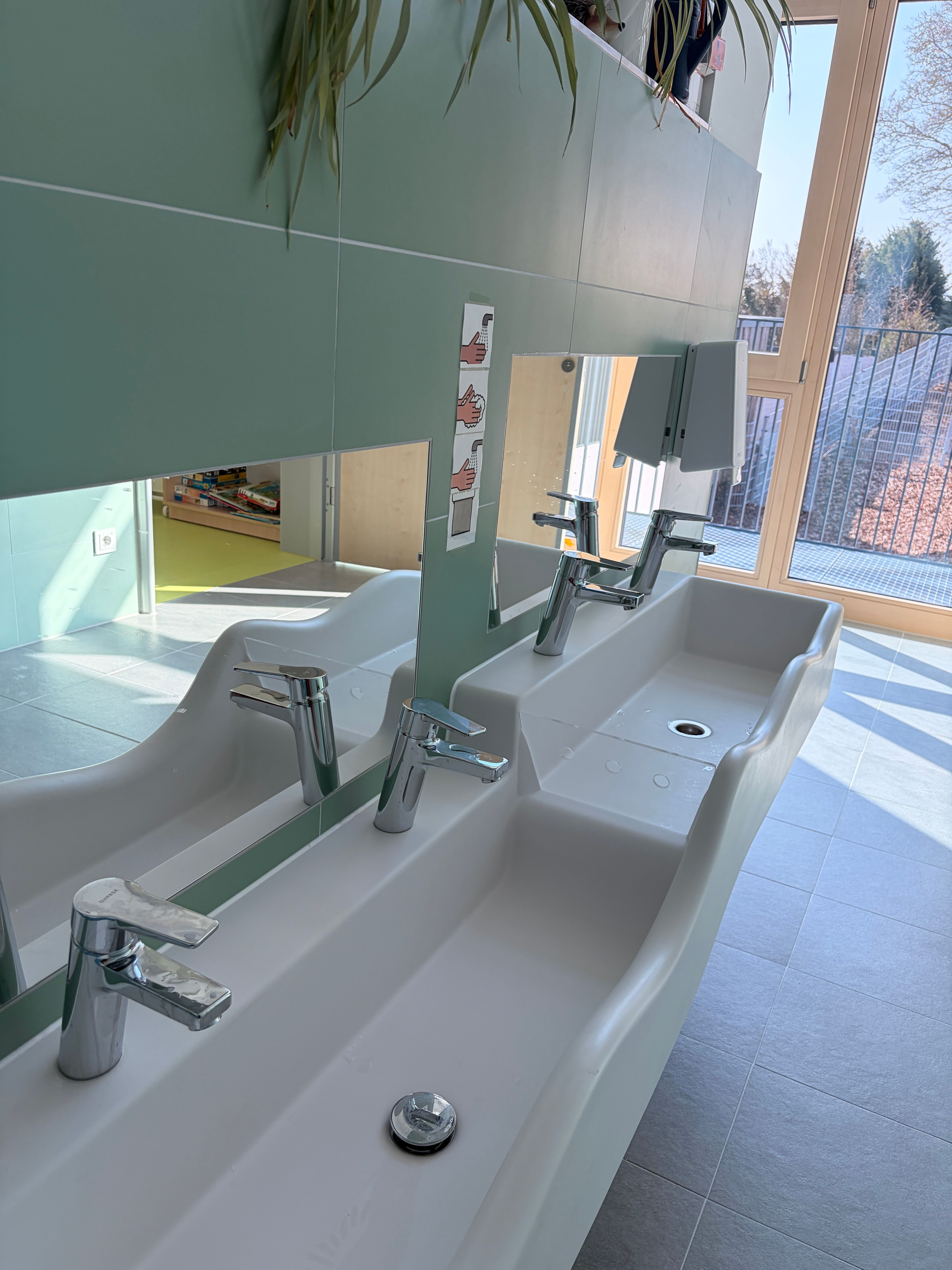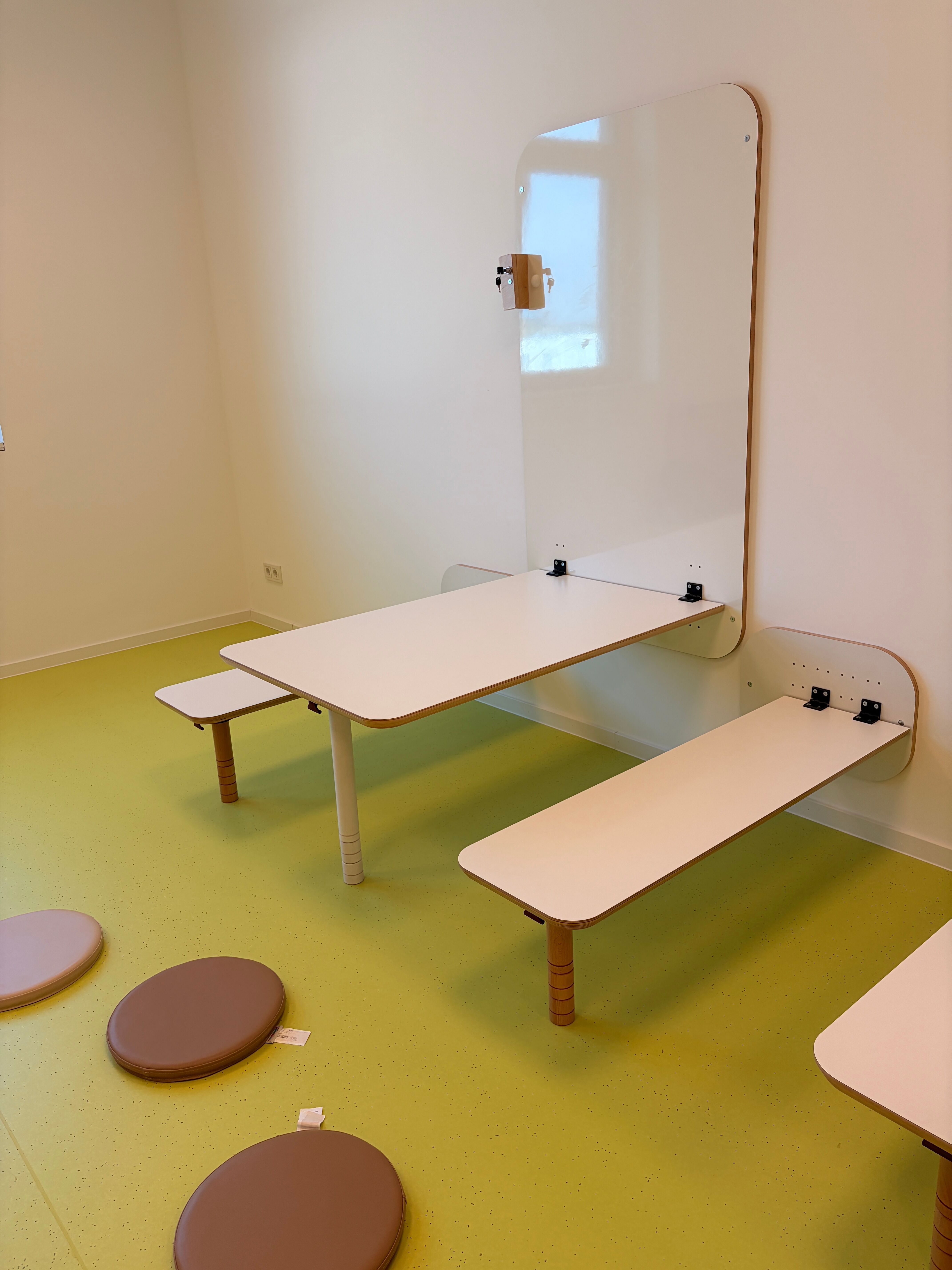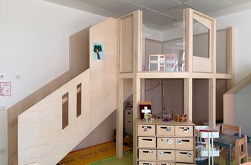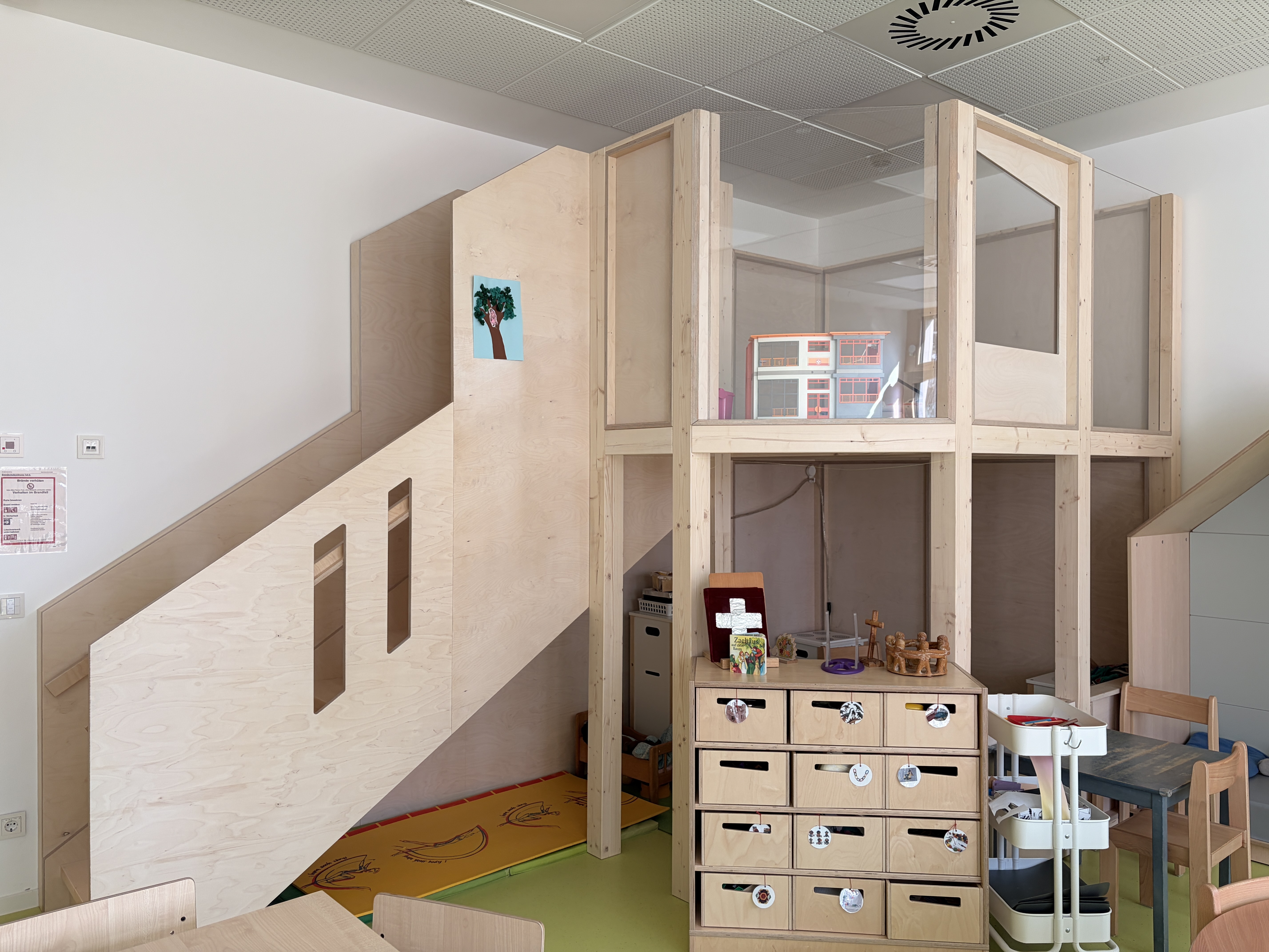 Die vielen Räume ermöglichen die Arbeit in Kleingruppen und die noch gezieltere Förderung der Kinder (Sprachförderung, Kochen, Backen, Vorschulübungen, Experimente, …), während andere im Gruppenraum weiter spielen. Sie dienen auch als Rückzugsorte, wenn Kinder eine Pause benötigen.