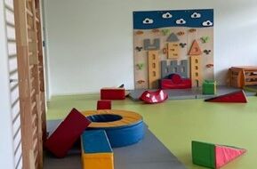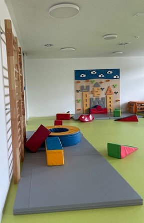 Im Bewegungsraum können die Kinder ihre Grobmotorik, ihr Körpergefühl und ihr Selbstvertrauen wetterunabhängig beim Toben und durch gezielte psychomotorische Angebote schulen.